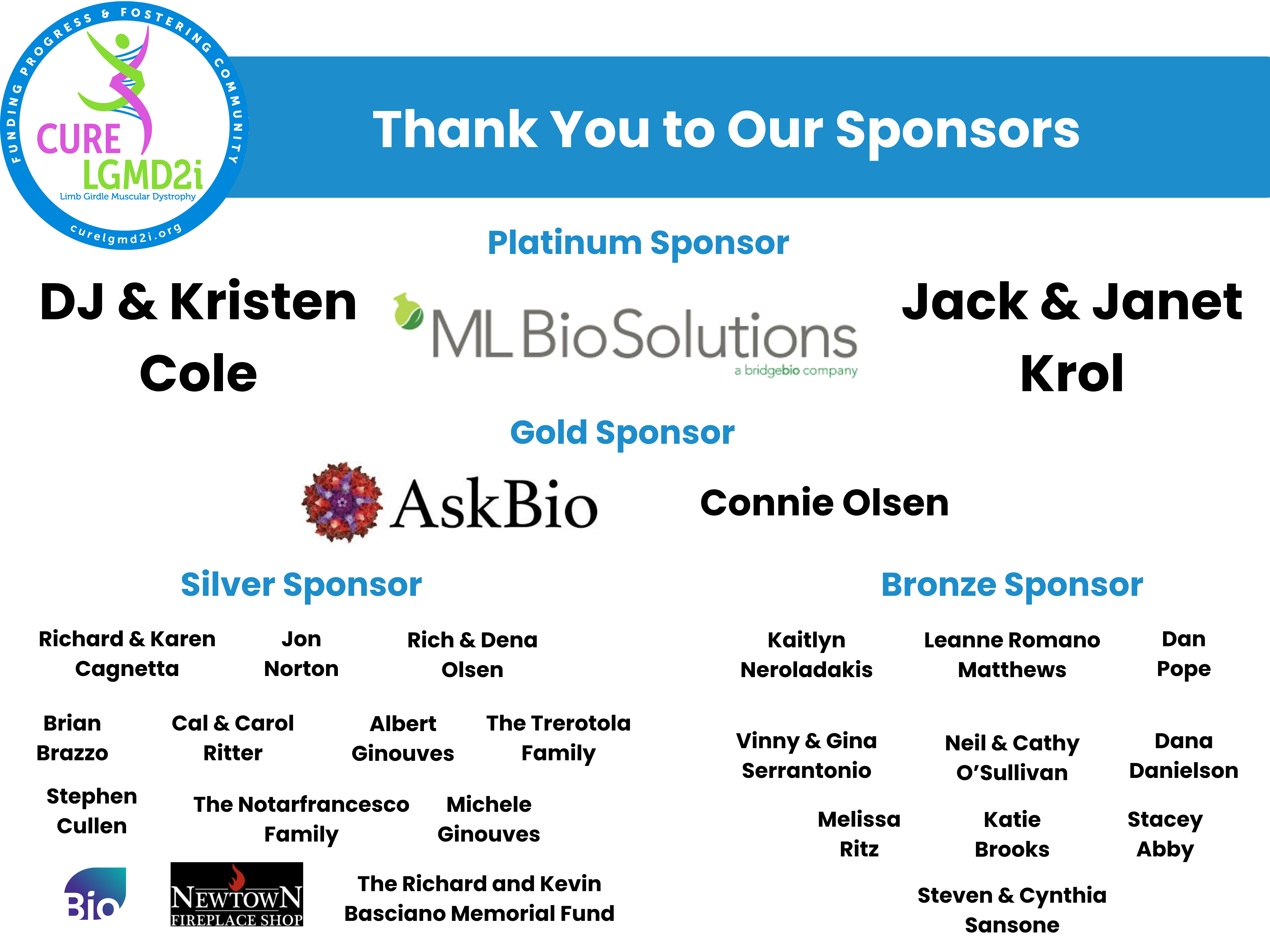 SPECIAL THANKS TO OUR SPONSORS. YOUR GENEROSITY AND SUPPORT OFOUR LGMD2I/R9 PATIENT COMMUNITY AND THIS EVENT IS GREATLY APPRECIATED!